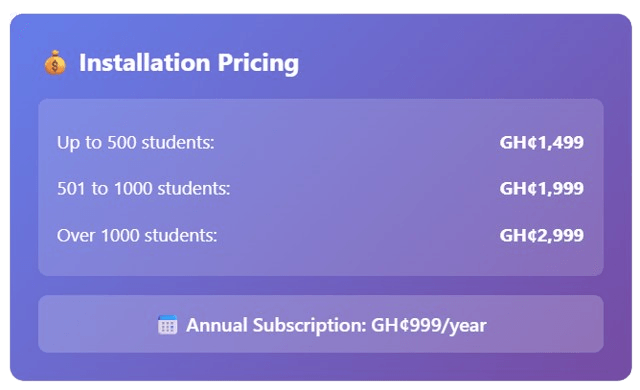 All Edutrack plans include the same full set of features. The only difference in pricing is your student population. Schools with up to 500 students pay GH¢1,499, up to 1,000 students pay GH¢1,999, and schools with over 1,000 students pay GH¢2,999. With a yearly GH¢999 maintenance fee. This way, schools only pay based on size — not on restricted features.